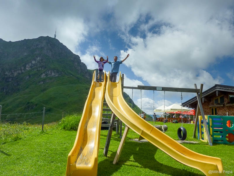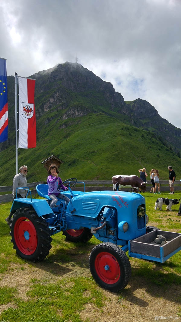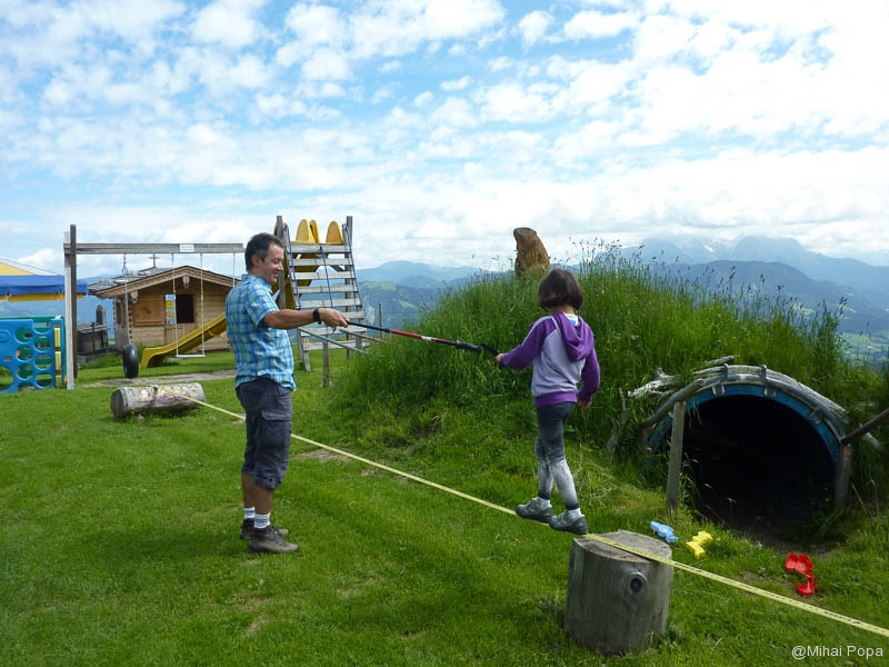 Eeee vara! Eeeee Austria. Pai se poate sa nu vedem noi muntele din Austria in plina vara? Nuuuu. Multi ne intreaba ce naiba facem vara in Austria. La multi le raspundem: o gramada! Dumetii, baie, bicicleta, aer, locuri de joaca, animale, lacuri, si cate si mai cate. Ziua 3-a o incepem in localitate. In spatele pensiunii noastre trona cu mandrie Kitzbuheler Horn – varful Kitzbuheler. Urcarea la el se facea din doua localitati: una de unde eram noi, ceea ce am si ales pentru ziua asta. Cealalta urcare este din Obendorf in Tirol. Deci luam cabina si sus! Mergem la punctul terminus al cabinei. Deja facem cunostinta cu zona de sus. Asta asteptam cam de anul trecut. Inca era racoare de dimineata, asa ca am incercat atractiile din locul de joaca special amenajat pentru copii. De aici se poate lua un fel de tricicleta cu care se coboara pana in sat. Din pacate era doar de o persoana, asa ca nu puteam cobora cu Maia. Si nici ea singura. Dar aici am reusit sa facem o drumetie spre varful Kitzbuheler. Pe drum am vazut familii care erau cu instructori si care faceau catarari de la cel mai mare la cel mai mic. Coborarea de aici a fost pe jos. Am mai avut o oprire la o cabana intermediara unde am servit un desert local. Era si un parc pentru catarari, dar din pacate pt Maia, toti erau cu grupuri. Am improvizat noi ceva pe marginea lacului.