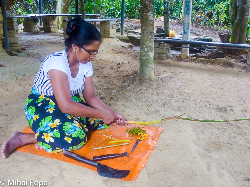 Inainte cu doua saptamani de plecarea noastra, am constatat ca Fortul din Galle este prea putin pentru o zi. Am solicitat la agentie sa ne adauge ceva suplimentar. Asa am primit Boat Safari. Dupa experienta cu balenele, era cat pe ce sa raman singur in Boat. Nu de alta, dar Roxana nu mai dorea o experienta similara. Se gandea la ceva rafting, initial. Dar asteptarile noastre au fost depasite. De fapt este o excursie cu barca pe un rau, care este extrem de asemanator ca loc cu Delta Dunarii de la noi. Este vorba de Maduganga Lake, un lac imens format pe cursul unui rau – Madu River, inainte de iesirea la ocean. Este foarte mare si are multe insule. Prima oprire a fost la o “ferma” de pesti terapeutici. Banii jos si picioarele in apa, sa aiba ce ciupi pestii. Apoi am ajuns pe insula de scortisoara. Aici am vazut intreg procesul de “extragere” a scortisoarei. Au taiat batul, l-au curatat, decojit si apoi l-au pus la uscat. Am vazut cum se impleteste si frunza de palmier plus cum se face sfoara din nuca de cocos, dupa ce este tinuta cateva luni sub apa. Dupa prezentare, au venit cu produsele lor la vanzare. Am plecat cu bete si cu cu praf de scortisoara. Am vizitat si o insula pe care era un templu Budhist. Aici un preot ne-a facut o slujba si am primit cu aceasta ocazie renumita ata pe mana dreapta. Sunt mai multe tipuri de rugaciuni, dar noi am avut parte de una de sanatate. Ne trebuia, ca eram racit cobza: aer conditionat, caldura afara, iar aer conditionat, baie in mare si aer conditionat in masina. Stia preotul la ce eram predispus! Interesant aici la templu a fost prezentarea cutiei medicinale traditionale, plina cu seminte de tot felul si in functie de necesitati, se macinau in diferite combinatii pentru a obtine medicamentul necesar tratarii diferitelor boli. Asta ca sa stim cum se tratau inaintasii nostrii sau ai lor. Am vazut si carti foarte vechi scrise pe frunza de palmier. In contextul asta am aflat si de ce toate literele lor sunt rotunde si fara linii verticale sau orizontale; pentru ca sa nu taie frunza cand scriau pe ea, logic nu?