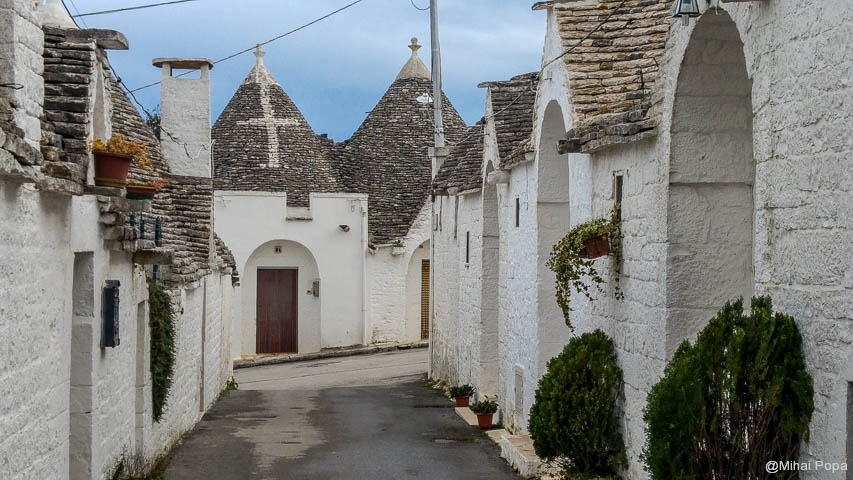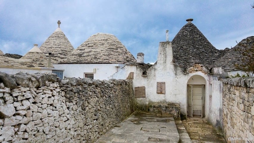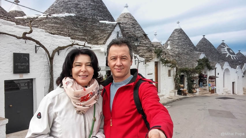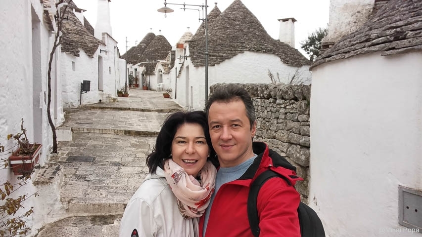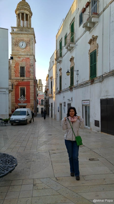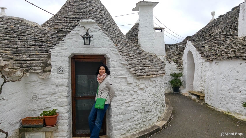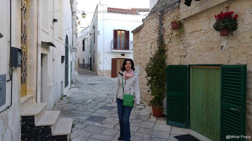 Pentru prima zi – prima destinatie aleasa a fost Arbelobello. So: Tren spre Arbellobelo. Am ajuns printre nori si picuri de ploaie in gara oraselului. Plimbare pana la primele stradute cu case tuguiate. Orasul era dinainte de Oblio. In afara de noi cred ca in ziua respectiva am mai vazut vreo 4-5 turisti prin sat. Ceea ce nu era rau. Casele nu mai sunt locuite. Intr-una am fost invitati de un nene de vreo 60 de ani, care a copilarit pe acolo. Ne-a tot povestit el de mama si de familia lui, dar italiana noastra … vai mama ei. Si, si, zimbete tampe, si si, si 5 euro am lasat in cutie. Casuta avea 4 turle, sub una livingul sub alta dormitorul, a treia – bucataria si ultima … baia. Toate separate de perdea. Macar oamenii erau puditi si nu din aia fara perdea. Am batut la pas cam toate stradutele. Cam. In alta casuta am fost la degustat. Intai de ciocolata: fistic, neagra, alba si cam atat. Apoi da-i cu lichioruri. Nu sunt fan, dar a meritat. Asa arome nici nu am stiut ca exista. Auzi: lichior de cactus, de migdale, de pepene samd. Deja afara se incalzise cu atatea arome la bord. Si cu doua sticlute in plasa. Prevedeam noi ce ne asteapta! E, si cand asteptam noi soarele sa fotam casutele alea asa cum erau in vederi, a venit o … plooaieee! Ora pranzului, fortat! Am mancat paste urechiuse, asa cum sunt specifice la ei. Si dupa pranz, cu ceva mila, am avut parte si de soare, asa ca ne-am “selfi” unul cu altul si cu soarele! O zi completa. Aproape, ca la 3 dupamasa toti erau la somn, daca va puteti inchipui si budele publice se inchid intre 13 si 17. Toti frate sunt la siesta. Si am spun noi, hai la Ostumi, ca mai avem cateva ore. Dupa zeci de minute de italenglish in gara, luam bilet de Ostumi, cu schimb dupa 3 statii si cu alt schimb de autobuz. Scria Ostumi pe noi. Numai bine ca ne urcam in trenul care vine, care nu trebuia sa vina si o luam in sens invers si ajungem la Noci – Nuci in romaneste. Aci am nimerit intr-un sat de nu cred ca au auzit ei de turisti. Dupa o tura prin centrul istoric ne-am intors la gara – inapoi la Bari, ca Ostumi acum era departe!