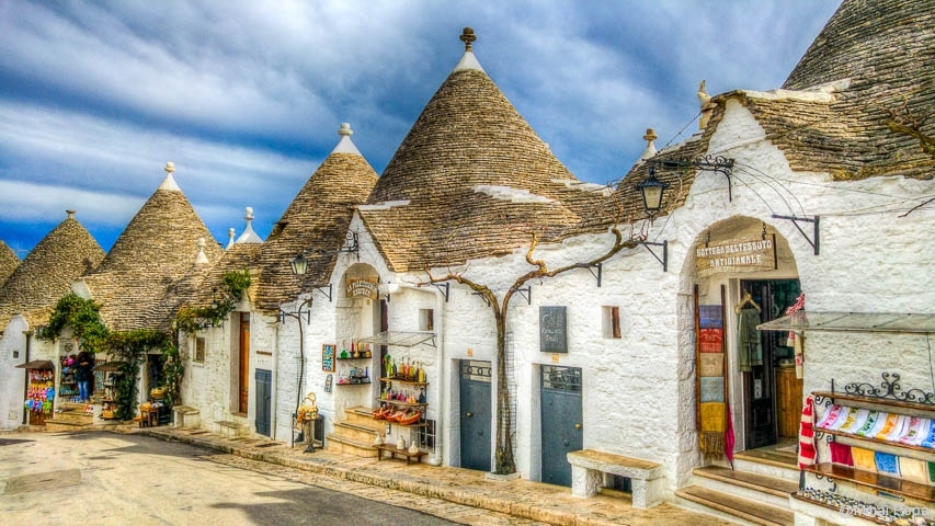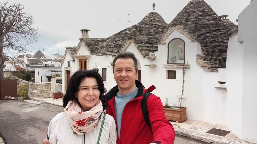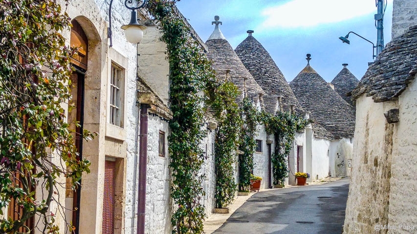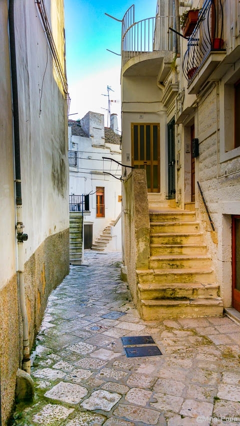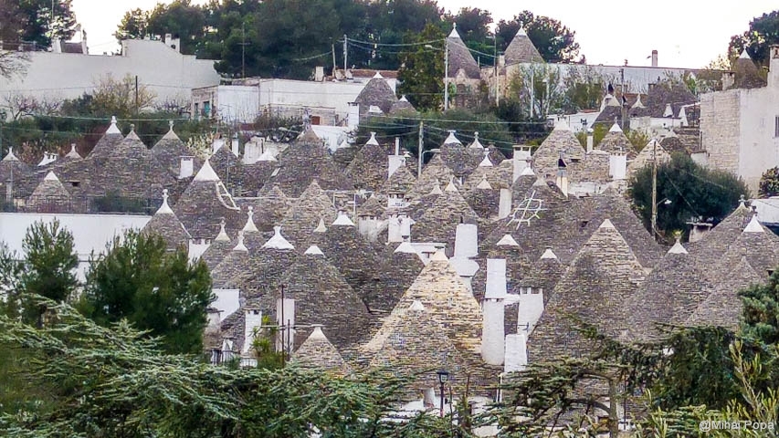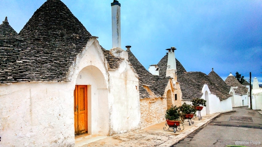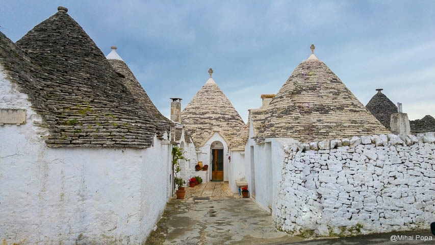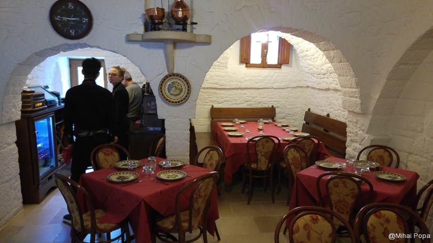 Pentru prima zi – prima destinatie aleasa a fost Arbelobello. So: Tren spre Arbellobelo. Am ajuns printre nori si picuri de ploaie in gara oraselului. Plimbare pana la primele stradute cu case tuguiate. Orasul era dinainte de Oblio. In afara de noi cred ca in ziua respectiva am mai vazut vreo 4-5 turisti prin sat. Ceea ce nu era rau. Casele nu mai sunt locuite. Intr-una am fost invitati de un nene de vreo 60 de ani, care a copilarit pe acolo. Ne-a tot povestit el de mama si de familia lui, dar italiana noastra … vai mama ei. Si, si, zimbete tampe, si si, si 5 euro am lasat in cutie. Casuta avea 4 turle, sub una livingul sub alta dormitorul, a treia – bucataria si ultima … baia. Toate separate de perdea. Macar oamenii erau puditi si nu din aia fara perdea. Am batut la pas cam toate stradutele. Cam. In alta casuta am fost la degustat. Intai de ciocolata: fistic, neagra, alba si cam atat. Apoi da-i cu lichioruri. Nu sunt fan, dar a meritat. Asa arome nici nu am stiut ca exista. Auzi: lichior de cactus, de migdale, de pepene samd. Deja afara se incalzise cu atatea arome la bord. Si cu doua sticlute in plasa. Prevedeam noi ce ne asteapta! E, si cand asteptam noi soarele sa fotam casutele alea asa cum erau in vederi, a venit o … plooaieee! Ora pranzului, fortat! Am mancat paste urechiuse, asa cum sunt specifice la ei. Si dupa pranz, cu ceva mila, am avut parte si de soare, asa ca ne-am “selfi” unul cu altul si cu soarele! O zi completa. Aproape, ca la 3 dupamasa toti erau la somn, daca va puteti inchipui si budele publice se inchid intre 13 si 17. Toti frate sunt la siesta. Si am spun noi, hai la Ostumi, ca mai avem cateva ore. Dupa zeci de minute de italenglish in gara, luam bilet de Ostumi, cu schimb dupa 3 statii si cu alt schimb de autobuz. Scria Ostumi pe noi. Numai bine ca ne urcam in trenul care vine, care nu trebuia sa vina si o luam in sens invers si ajungem la Noci – Nuci in romaneste. Aci am nimerit intr-un sat de nu cred ca au auzit ei de turisti. Dupa o tura prin centrul istoric ne-am intors la gara – inapoi la Bari, ca Ostumi acum era departe!